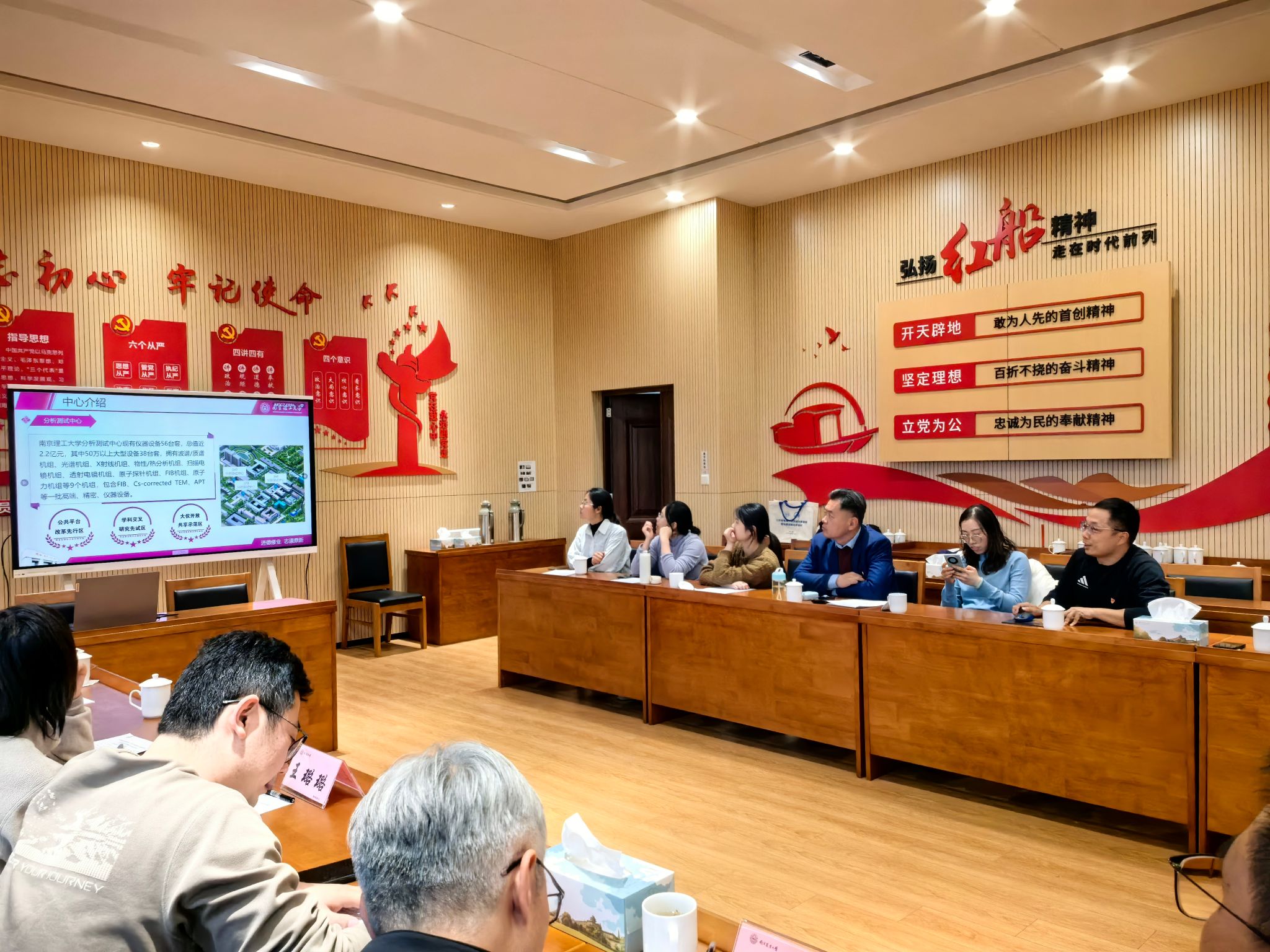 业务交流阶段,胡健介绍了南农白马教学科研基地的建设背景、功能定位及运行成效;南理工分测中心主任助理夏锡锋、南农分测中心主任马洪雨分别介绍了各自平台情况;三方围绕科技资源共享、仪器设备协作、人才培养等热点问题展开深入探讨。